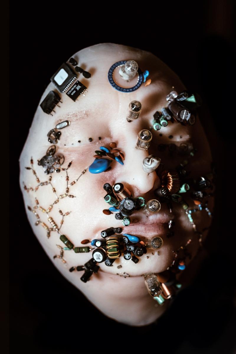 digitalWrite(HIGH) is created with components of these prostheses as well as waste materials, the human byproducts of externalization of tool creation. The surface and material of the mask is injured, violating the integrity of the silicone and wounding the prosthetic itself. This wound positions itself between forgetting and remembering, remaining open where it is otherwise knit together by unseen scars, by technologic prosthetics.  Electrical components, the guts and viscera of computational power, have been integrated into the inert silicone where they are completely unable to conduct any current. Camera flash bulbs have been set off through the mask via piercing wirework, destroying both in the process. These components do damage to both the prosthetic and the human. Many of the encompassed technological traces are also toxic to the human life they enrich, damaging organ systems and causing tumor generation and growth when they are a part of the tissue that reintegrates the extant and the forgotten.